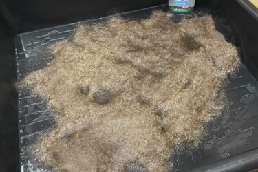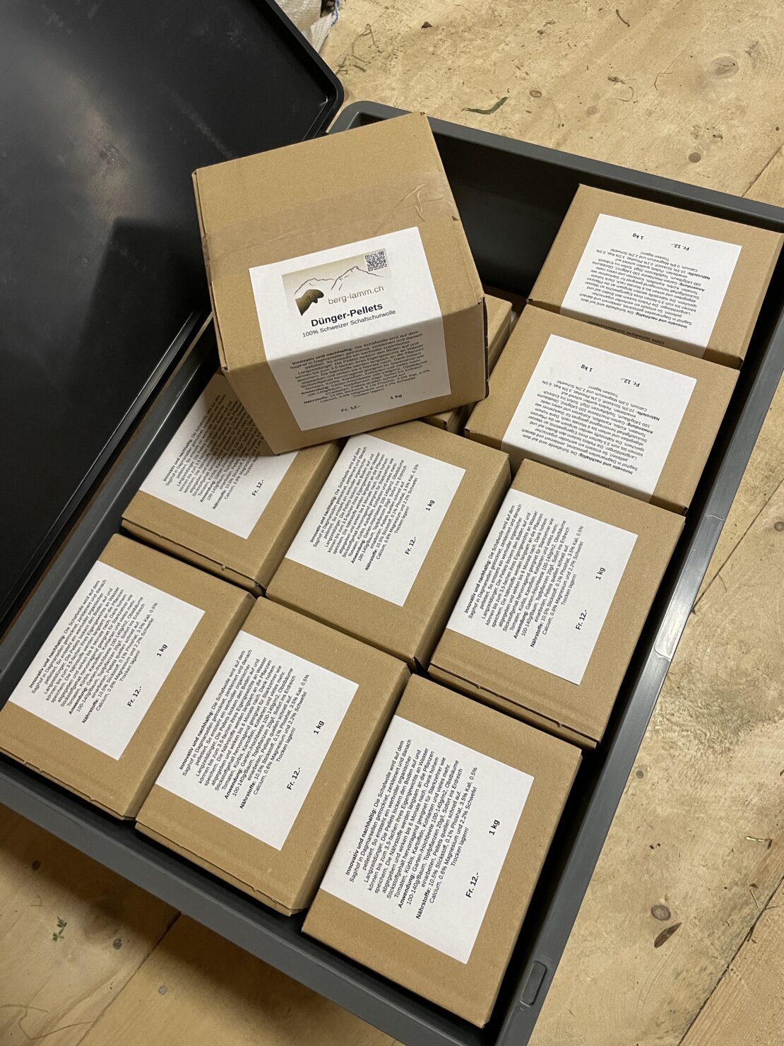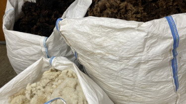 Während des Scherens nehmen wir in einem ersten Schritt die kurze Bauch-, Bein und Kopfwolle weg, aus dieser lassen wir Düngerpellets herstellen. Gleichzeitig sortieren wir die Schafwolle bereits jetzt nach Farben.