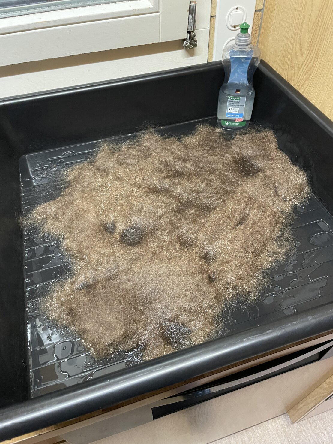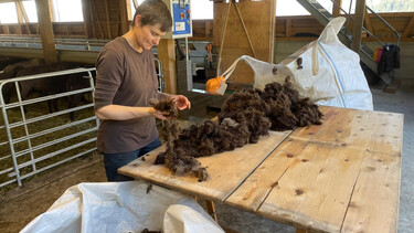 Bevor wir die Wolle zum Waschen bringen, müssen noch sämtliche Verunreinigungen wie Stroh, Dreck und Stichelhaare entfernt werden, dies dauert meistens mehrere Stunden.