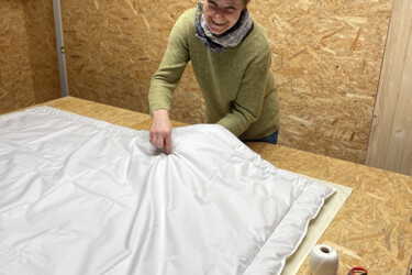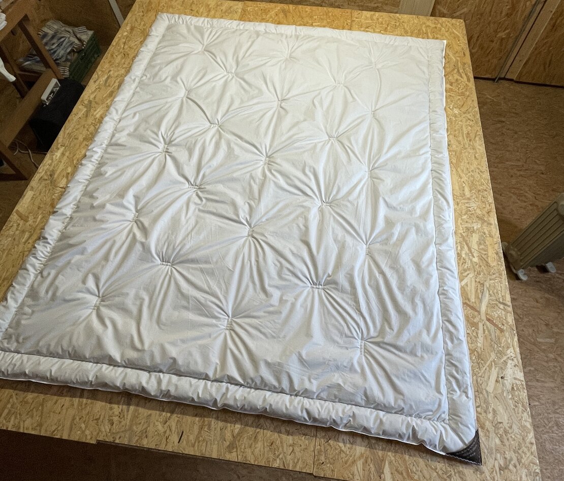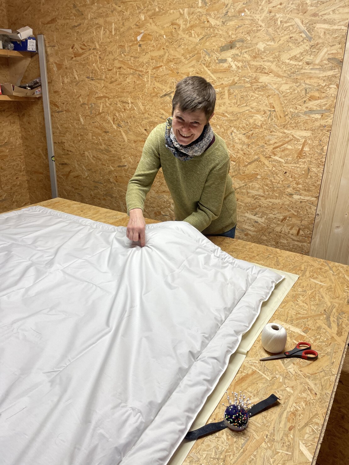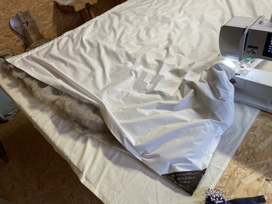 Ebenfalls bieten wir ihnen unsere reinen Schurwollduvets zum Kauf an. Nach der Schafschur bringen wir die frische Wolle in die Wollwäscherei nach Arth SZ. Dort wird sie gewaschen und wieder getrocknet. Anschliessend wird die Schafwolle nach Amsteg UR gebracht, wo sie auf der grossen Kardiermaschine zu einem zusammenhängenden Vlies verarbeitet wird. Von dort holen wir unsere Wolle wieder ab und Regula näht zuhause in liebevoller Handarbeit die Duvets ganz nach Wunsch unserer Kunden. Die Duvetgrösse (von 100 x 135 cm bis 240 x 240 cm) und die Füllmenge darf ganz nach ihren Bedürfnissen ausgewählt werden und in ca 3-4 Wochen (im Sommer kann es manchmal auch länger dauern) wird ihnen ihr gewünschtes Duvet per Post nach Hause geliefert. Zögern sie nicht, uns anzurufen, wir beraten sie sehr gerne.