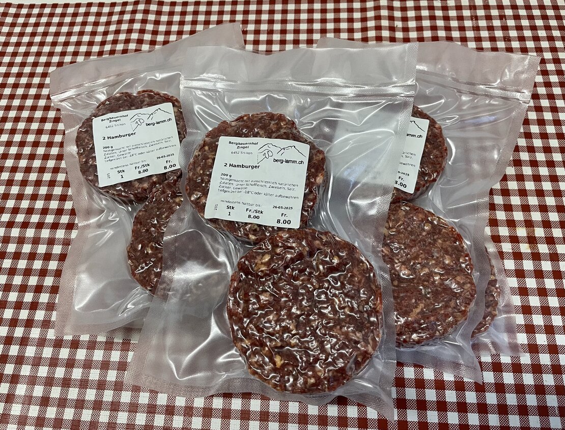 Hamburger: 100 % eigenes Schaffleisch, eigene Gewürzmischung mit ausschliesslich natürlichen Zutaten, liebevoll von Hand verarbeitet und tiefgefroren. Zu den Angeboten